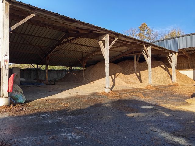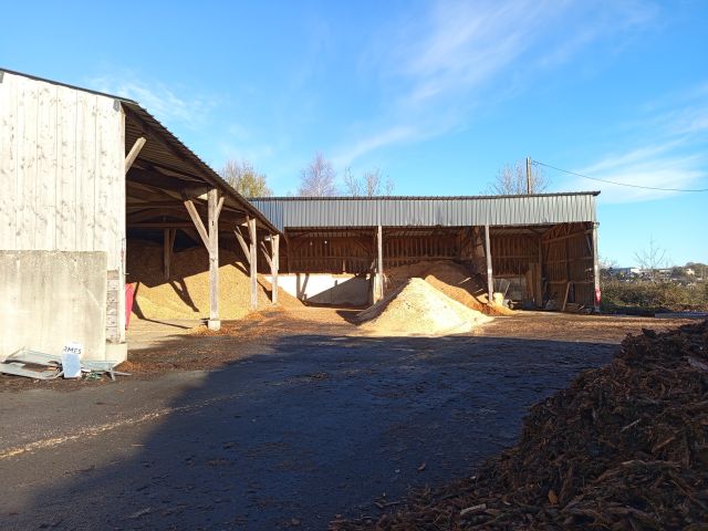 2 bâtiments ouverts (type hangar/plateforme stockage bois) avec hauteur permettant de pénétrer avec un élévateur.